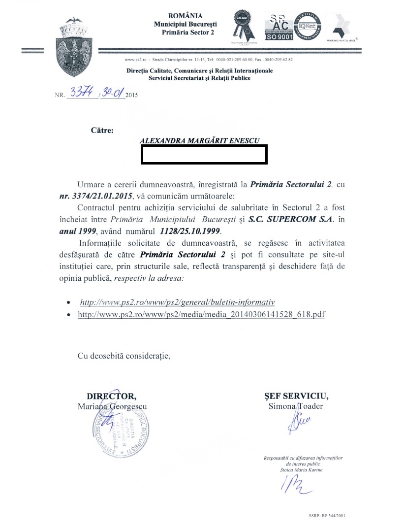 Zâmbiți? Eu nu (mai) zâmbesc. Astăzi am primit răspunsul Primăriei Sectorului 2 la cererea mea referitoare la contractul cu Supercom pentru curățenie și deszăpezire în sectorul 2.