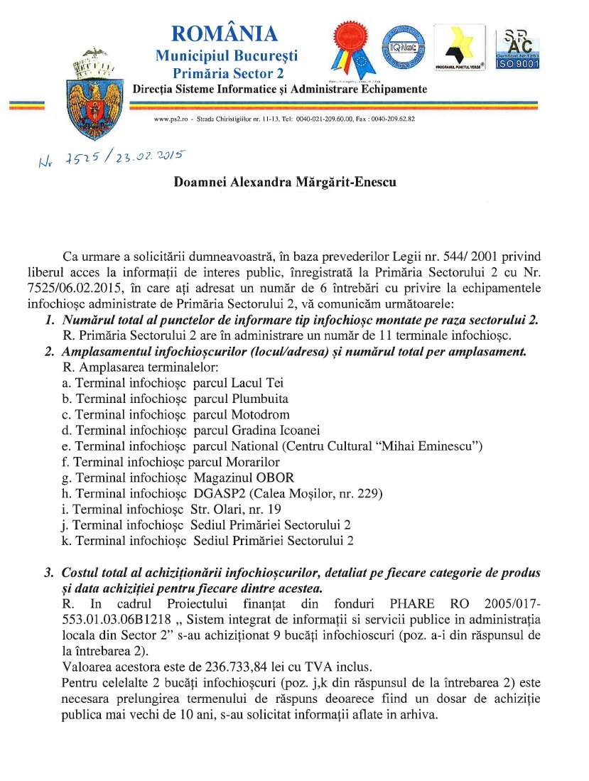 Ieri, am sunat la Primăria Sectorului 2 să-i rog să transmită răspunsul la cererea legată de infochioșcuri. Ieri, am scris despre asta aici. Ieri, la ora 15.25, Primăria Sectorului 2 a transmis răspunsul.