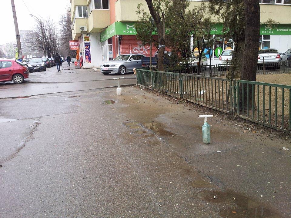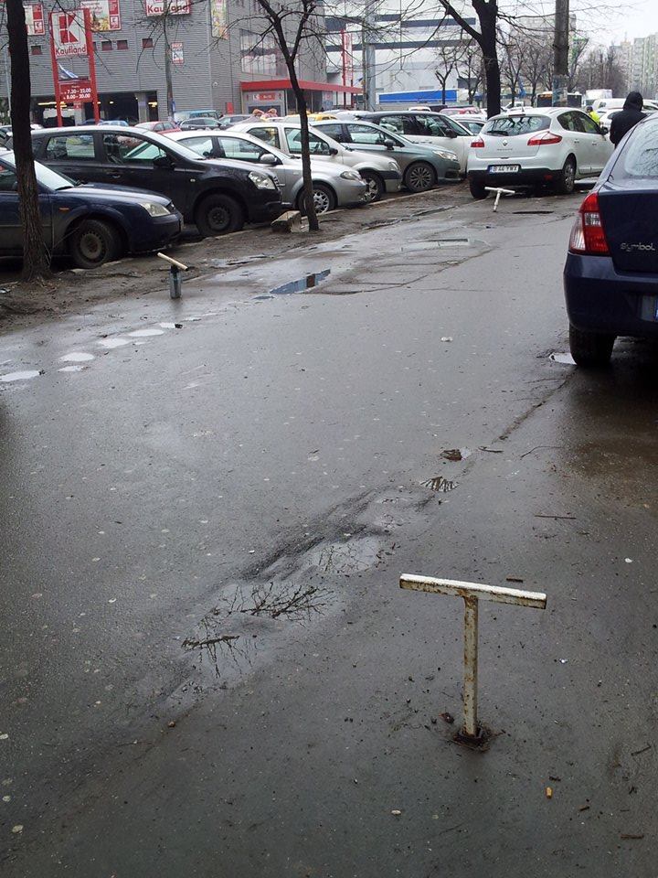 Andreea a trimis două fotografii făcute pe trotuarul de pe Șoseaua Pantelimon (vizavi de Kaufland Pantelimon). Ele arată un obicei vechi al românului cu simțul proprietății – T-ul locului de parcare.