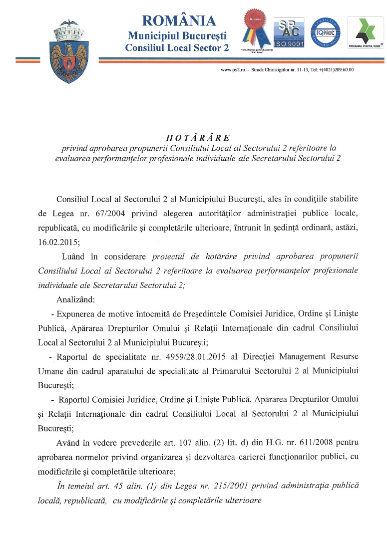 Câtă libertate de exprimare și obiectivitate să aibă Președintele Comisiei Juridice și Directorul Direcției Resurse Umane când știu că cel evaluat va semna hotărârea cu propunerile lor? Iar cel evaluat este Secretarul Sectorului 2….