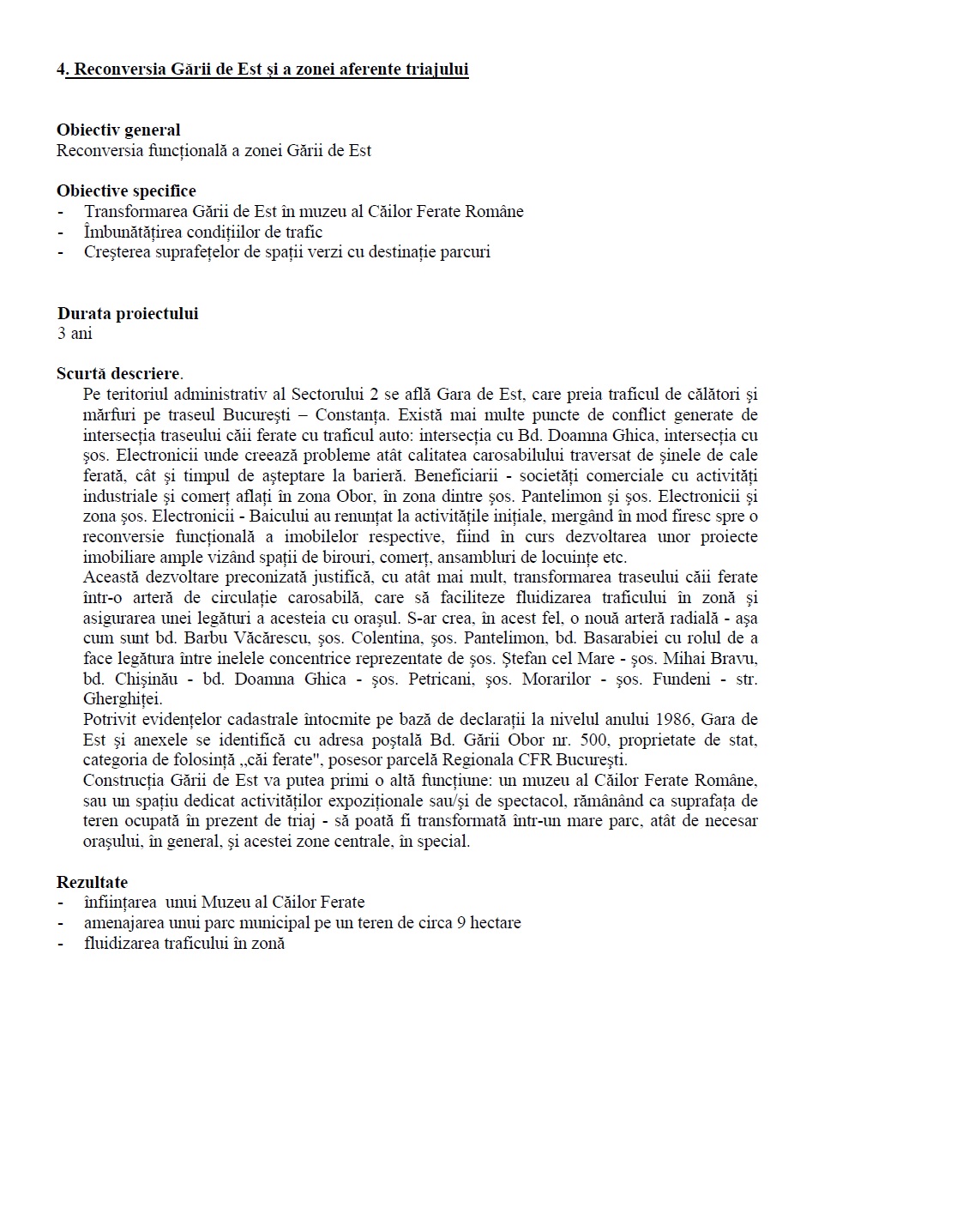 Astăzi, vă povestesc despre Măsura 4 – Reconversia Gării de Est şi a zonei aferente triajului, în muzeu/centru cultural şi parc, cu transformarea căii de rulare în arteră carosabilă şi, ca alternativă, păstrarea funcţiunii cu modernizarea sistemului de transport şi introducerea căii de rulare în subteran, de la Gara de Est până la intersecţia cu calea ferată Bucureşti-Constanţa – traseu metrou.