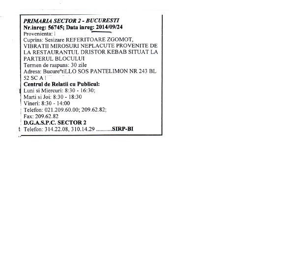Domnișoara de care vă povestesc nu a stat să aștepte rezolvarea problemelor de la sine, ci s-a implicat activ. A trimis reclamații și sesizări către Primăria Sectorului 2, Poliția Locală a Sectorului 2 și Secția 9 Poliție. A cerut chiar și o audiență la Primarul ales dar absent, unde i s-a spus să tacă și să suporte că “astea sunt idicațiile de mai sus”.