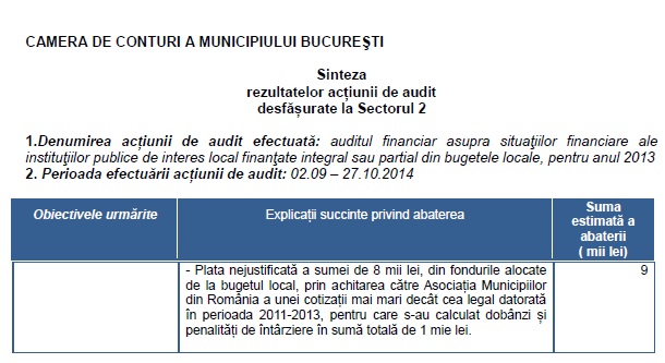 Ceea ce mă pune pe gânduri este o altă abatere constatată de Camera de Conturi a Municipiului București – plata necuvenită a unei cotizații de 8000 de lei la care se adaugă penalități de 1000 de lei în contul Asociației Municipiilor din România, adică un total de 9000 de lei, plătiți în plus, așa, pur și simplu….