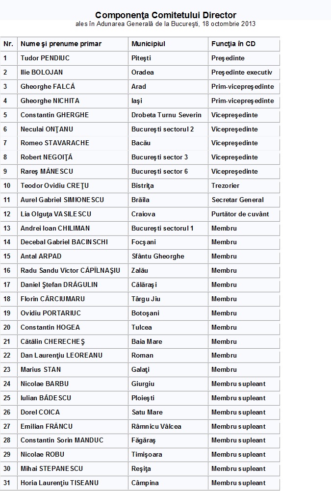 Vă rog să vă uitați cu atenție la numele președintelui și vicepreședinților. Eu găsesc un numitor comun – sunt în arest sau sunt cercetați pentru acte de corupție, abuz în serviciu, etc. Tudor Pendiuc (fostul primar al Piteștiului) este arestat. Romeo Stavarache (primarul Bacăului) – arestat preventiv și apoi în arest la domiciliu. Gheorghe Nichita (primarul Iașului) – cercetat în arest la domiciliu. Gheorghe Falcă (primarul Aradului) – trimis în judecată de DNA pentru infracţiunile de luare de mită şi abuz în serviciu contra intereselor publice, achitat de Tribunalul Alba.