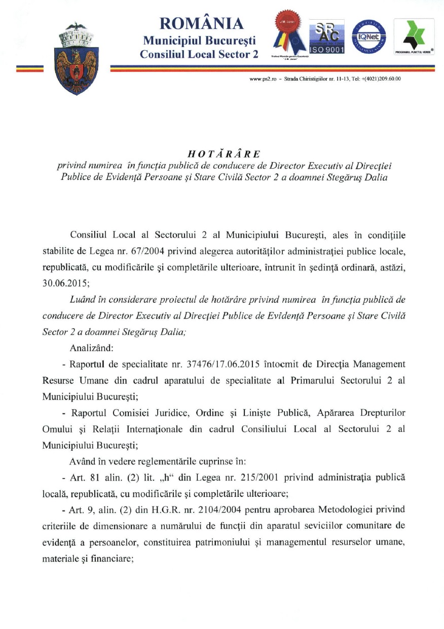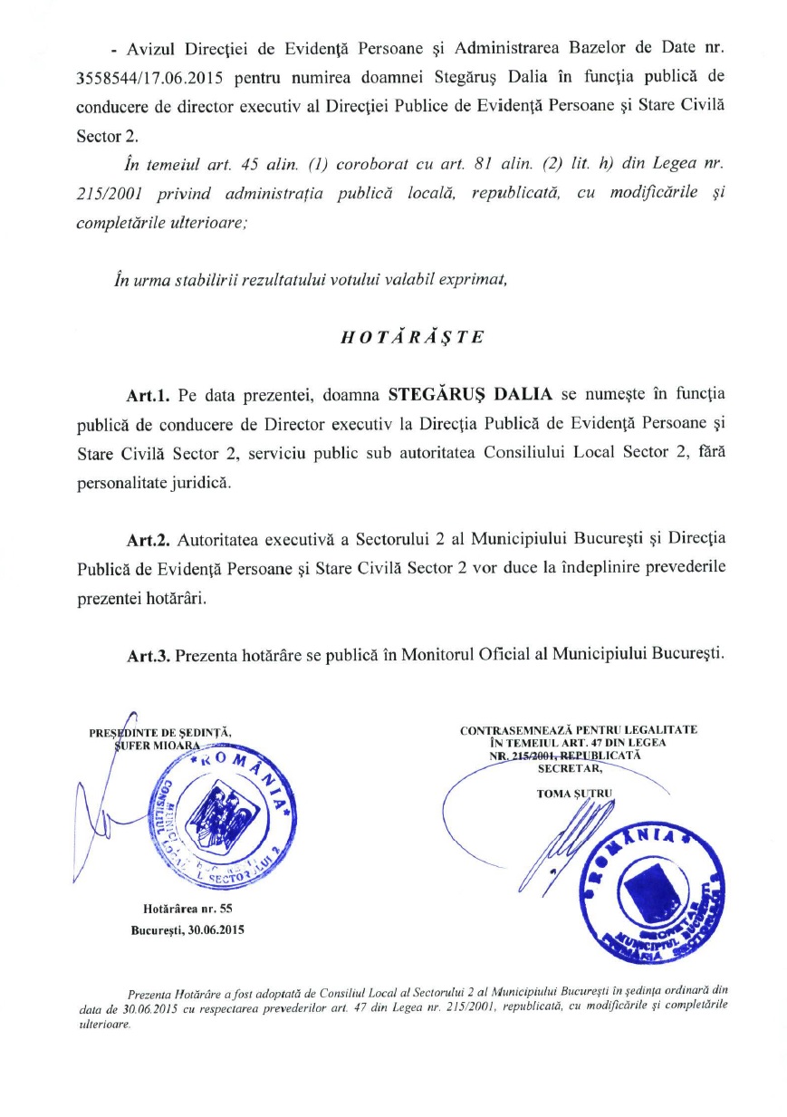 Ceva se întâmplă însă, fiindcă începând cu data de 30.06.2015, odată cu adoptarea unei Hotărâri de Consiliu Local, doamna Stegăruș schimbă funcția și va coordona, în calitate de Director executiv, Direcția Publică de Evidență Persoane și Stare Civilă Sector 2.