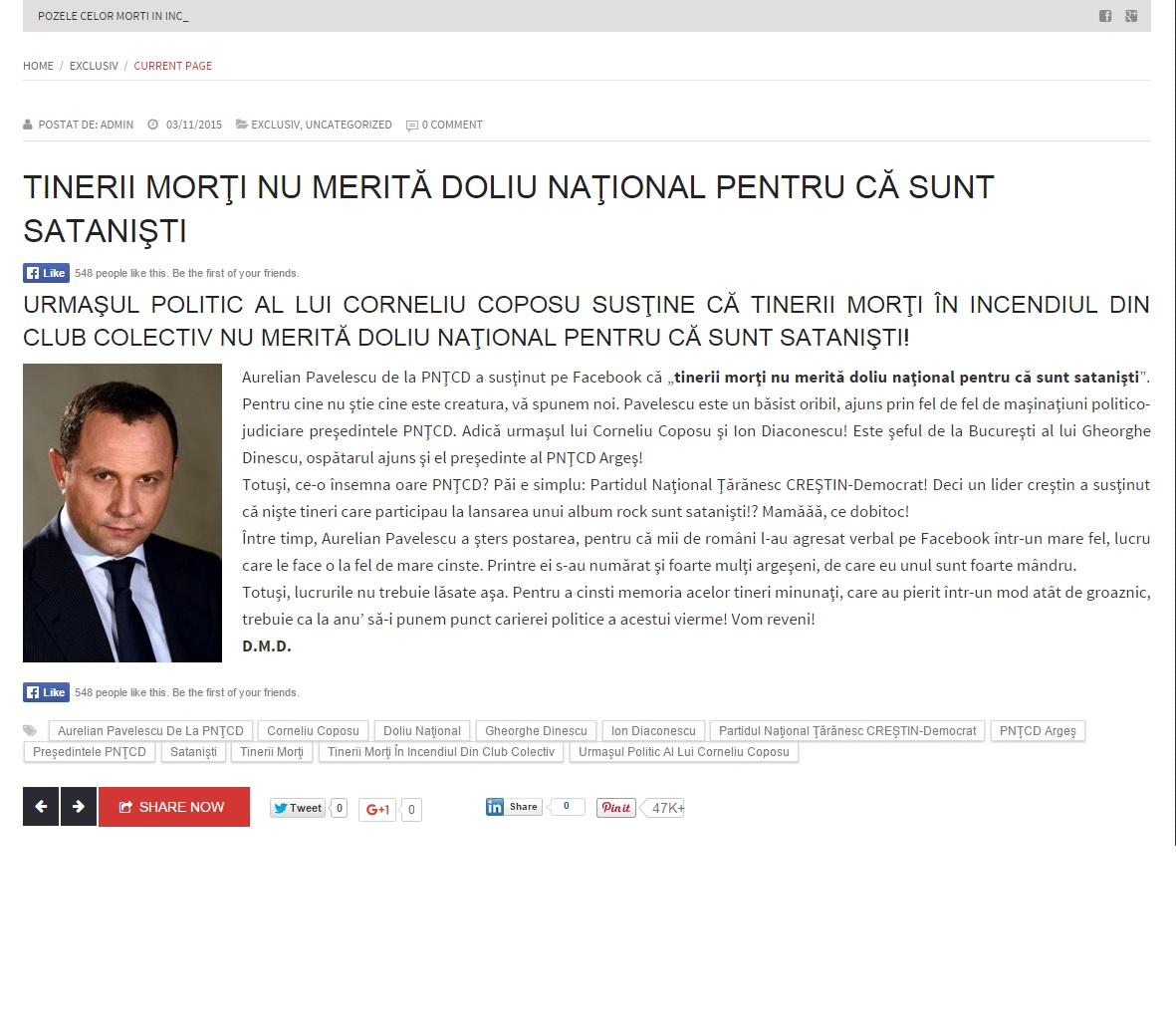 Primul n-a înțeles nimic din ceea ce s-a întâmplat. El crede că „a ars administrația publică acolo în club” ?! Să-i spună totuși cineva că în Colectiv au ars oameni, suflete, cu sutele, nu administrația locală. Și apoi vorbește despre lucruri pe care vor proștii să le-audă – ce s-ar întâmpla la un cutremur mare? Ce s-ar întâmpla? Ar muri mulți oameni. Oriunde în lume s-ar întâmpla asta. Și nu pentru că nu avem spitale și doctori – care au dovedit că sunt eroi zilele astea, ci pentru că așa sunt calamitățile, nasoale, mor mulți oameni. Și atât. Dar nah, vorbește Dan Cristian Popescu, un oportunist care se crede Primar și care ar trebui să tacă….mult și bine….