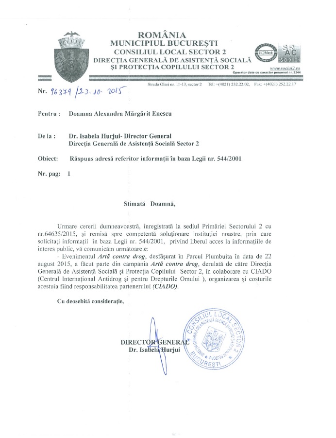 Acum 100 de zile (mai mult, sau mai puțin, e o chestiune relativă pentru că oricum au depășit cu mult termenul prevăzut de lege), am cerut Primăriei Sectorului 2 o informație de interes public. Am vrut să știu cât a costat organizarea unui concert în Parcul Plumbuita [eu și fixațiile mele cu evenimentele Primăriei 🙂 ]. Concertul era o porcărie cu actori necunoscuți dar era organizat sub egida unui mare angajament: Artă contra drog. Partenerul principal al Primăriei sectorului 2 era Centrul Internaţional Antidrog şi Pentru Drepturile Omului (CIADO), organizație condusă de controversatul Gigel Lazăr, care a petrecut vreo 4 ani la pușcărie, acuzat de emitere de cecuri fără acoperire. Toate detaliile le găsiți AICI.