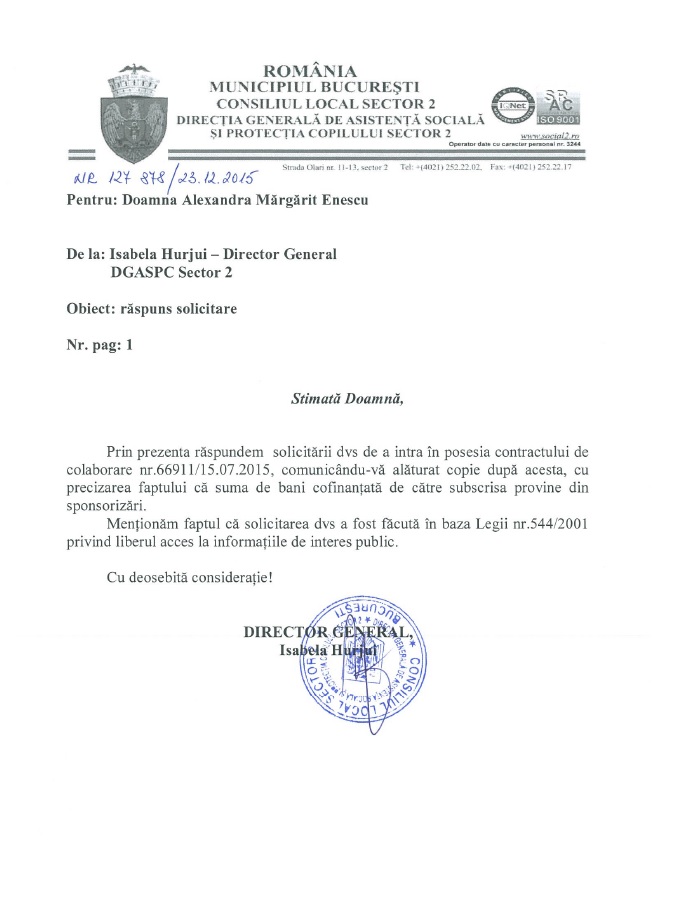Dar mă cunoașteți, eu nu mă mulțumesc cu puțin. 🙂 Păi cum să cred eu că Primăria sectorului 2 face evenimente fără să cheltuiască bani? Ar fi o inepție, n-ar mai fi Primăria sectorului 2. Primăria sectorului 2 trăiește pentru a cheltui bani publici. 🙂 Am cerut prin urmare, suplimentar, protocolul încheiat între DGASPC S2 și CIADO, să vadă și ochiul meu cum cheltuie alții bani pentru evenimentele domnului Primar Onțanu.