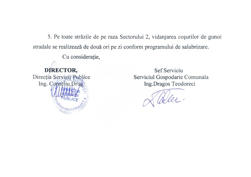 Acum vreo două luni, Primăria sectorului 2 mi-a trimis un răspuns la o solicitare de informații privind frecvența golirii coșurilor de gunoi din sector, hârtie pe care semnau doi oficiali. Ambii au girat cu numele pentru faptul că gunoiul se ridică de două (2) ori pe zi la noi în sector.