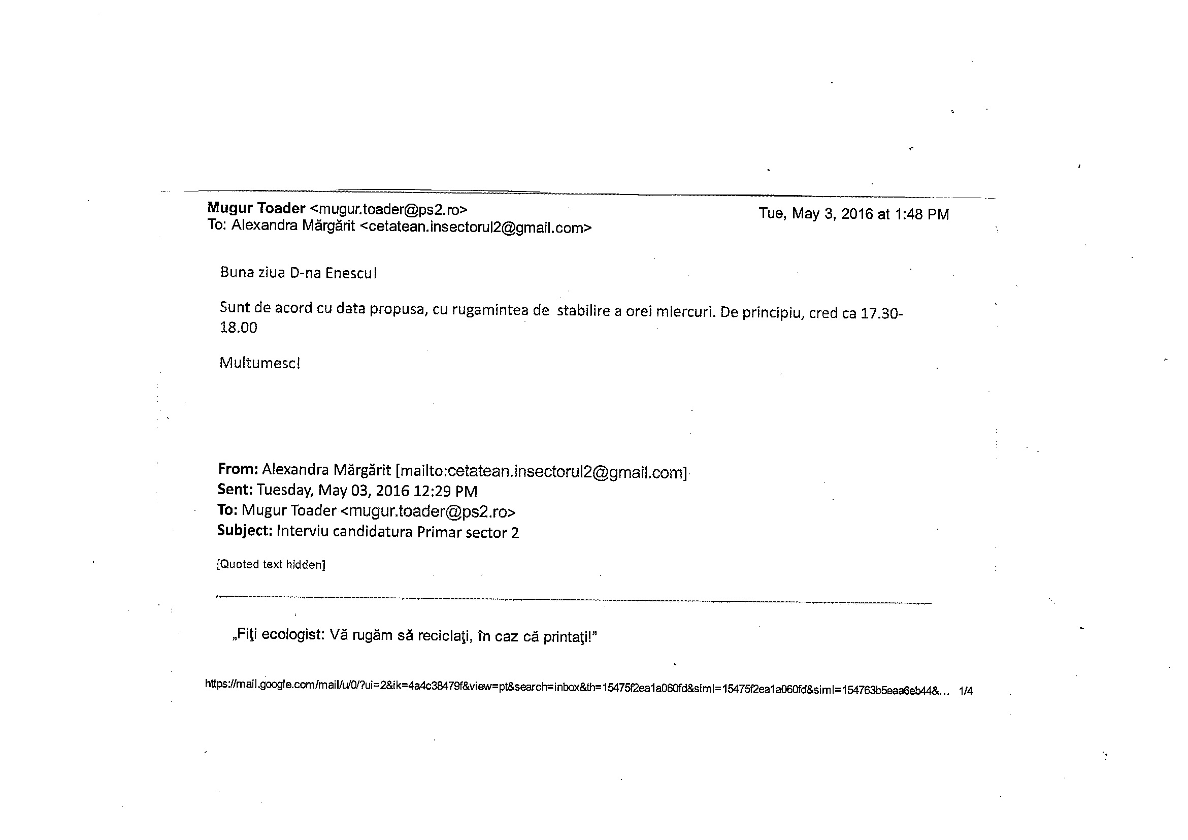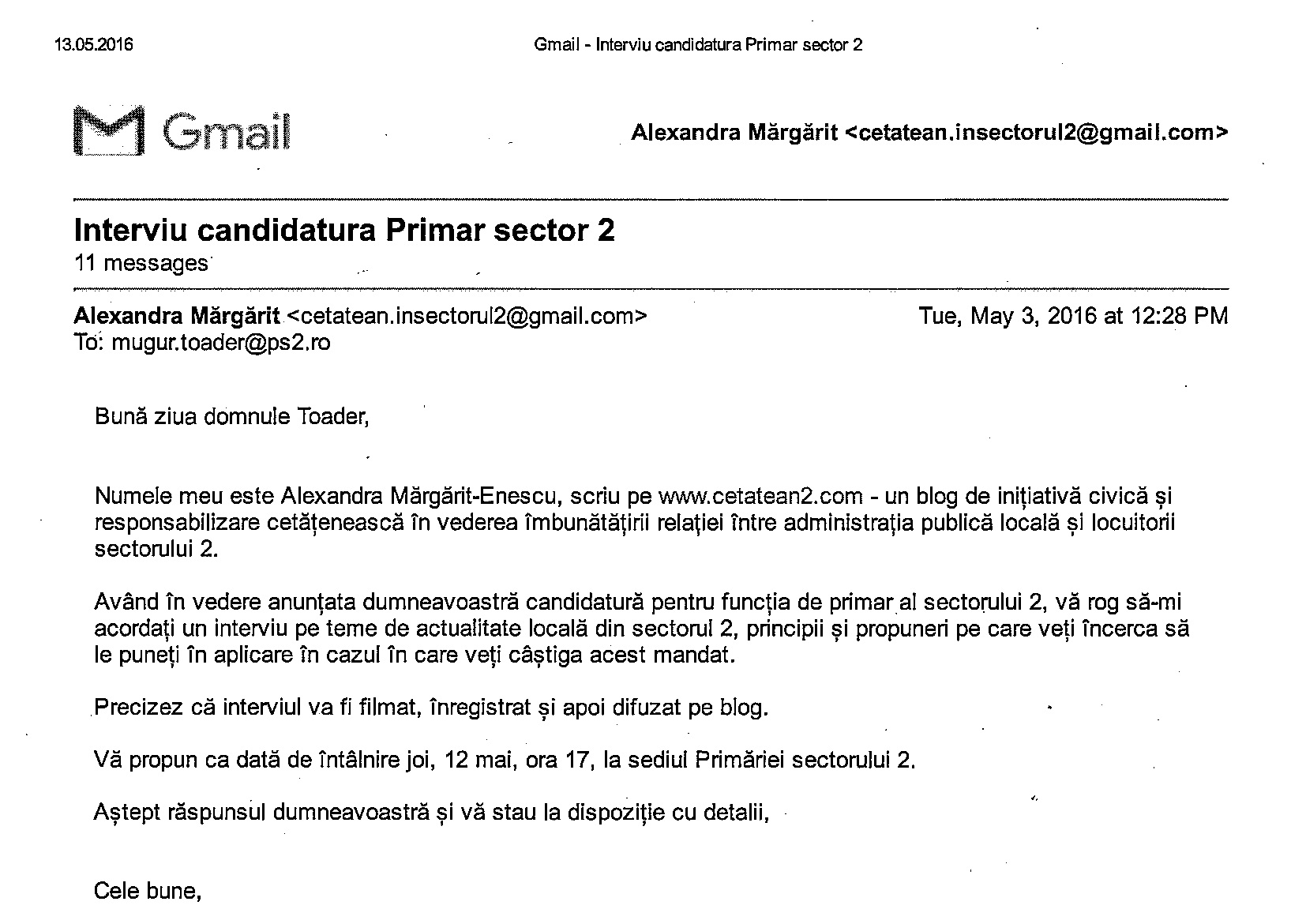 Am solicitat, așadar, pe 3 mai, celor doi, acordarea unui interviu pentru a-i cunoaște mai bine, a discuta proiectele de campanie și motivele pentru care le-am acorda încrederea noastră.