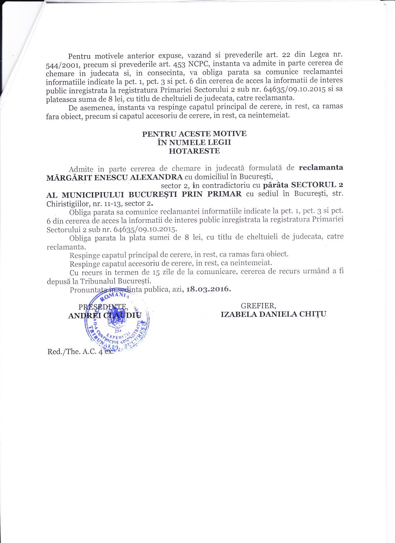 E drept că ceea ce voi scrie acum nu mai e cu adevărat o ştire pentru mine. Ştiu deja de mai bine de 6 luni că am câştigat un proces în instanţă cu „pârâta” Primăria sectorului 2. Nu am scris însă despre asta pentru că una e să vezi soluţia pe scurt, publicată pe portalul instanţelor de judecată şi alta e să ai hotărârea în mâini, să o citeşti, să o răsfoieşti, să vezi explicaţiile judecătorului, să vezi stângăcia apărării etc.