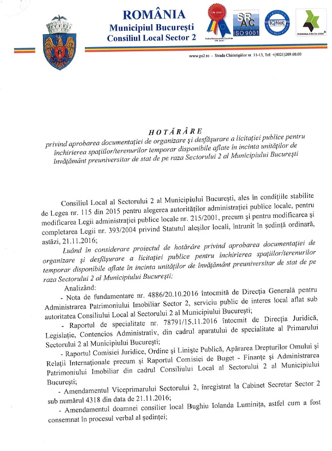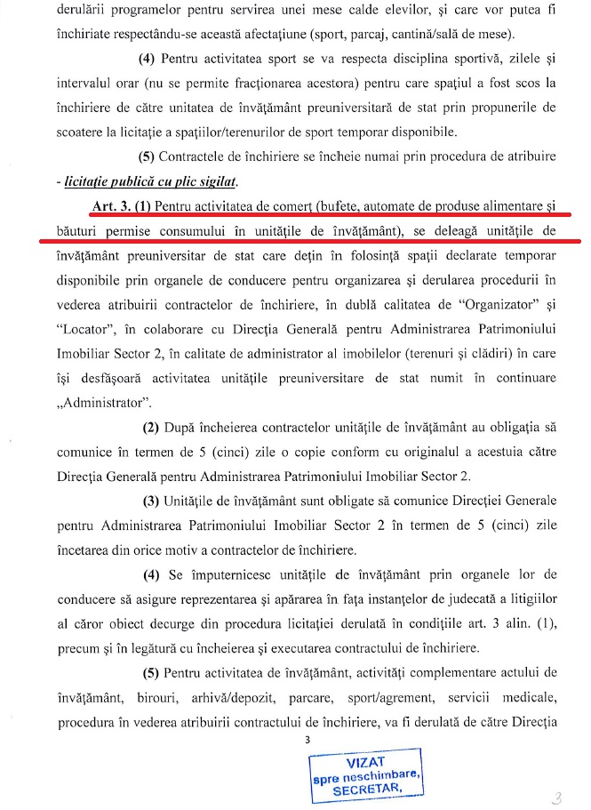 O Hotărâre a Consiliului Local Sector 2 recent aprobată, reglementează organizarea și desfășurarea licitațiilor pentru închirierea spațiilor din școli către operatori comerciali care vor desfășura în școli activități de comerț tip bufet, automate de produse alimentare și băuturi.