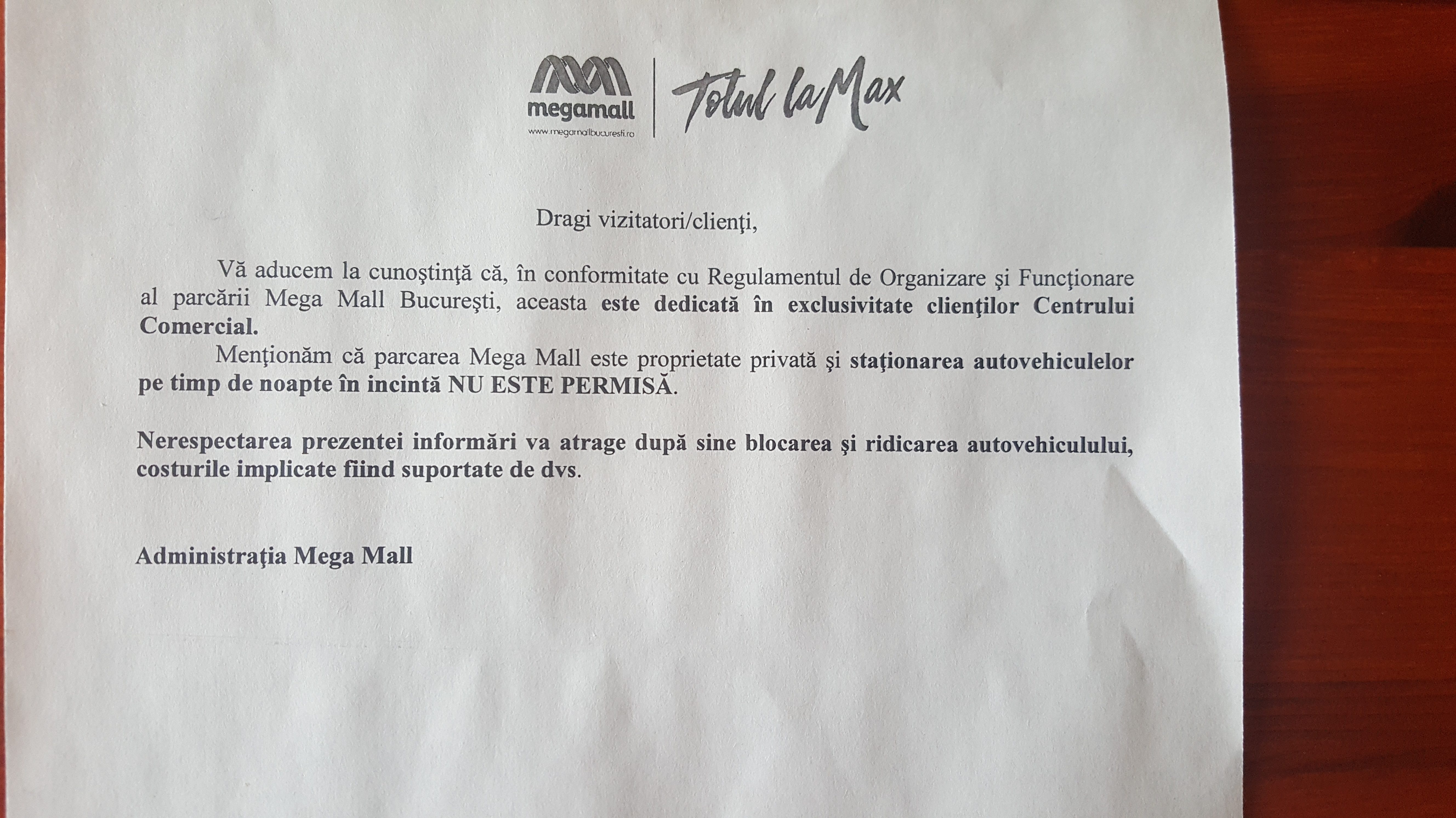 Eu stau în zonă. În perioada cu ninsori abundente, Mega Mall a hăituit, ca pe câini, toți șoferii. Sistemul audio din mall se oprea din când în când din difuzat muzică și anunța că parcarea pe timp de noapte este strict interzisă și că toate autoturismele lăsate peste noapte vor fi ridicate și se vor da sancțiuni. Echipele firmei de pază au blocat cu mașini intrările principale în subsolul parcării Mega Mall. Practic, nu se mai putea intra în parcare dinspre Pierre de Coubertain și nici coborî la subsol prin mall.