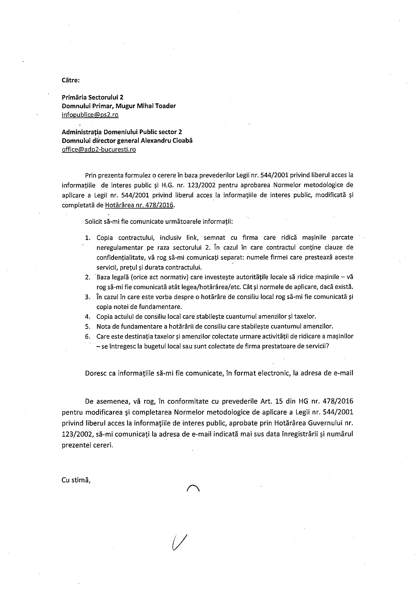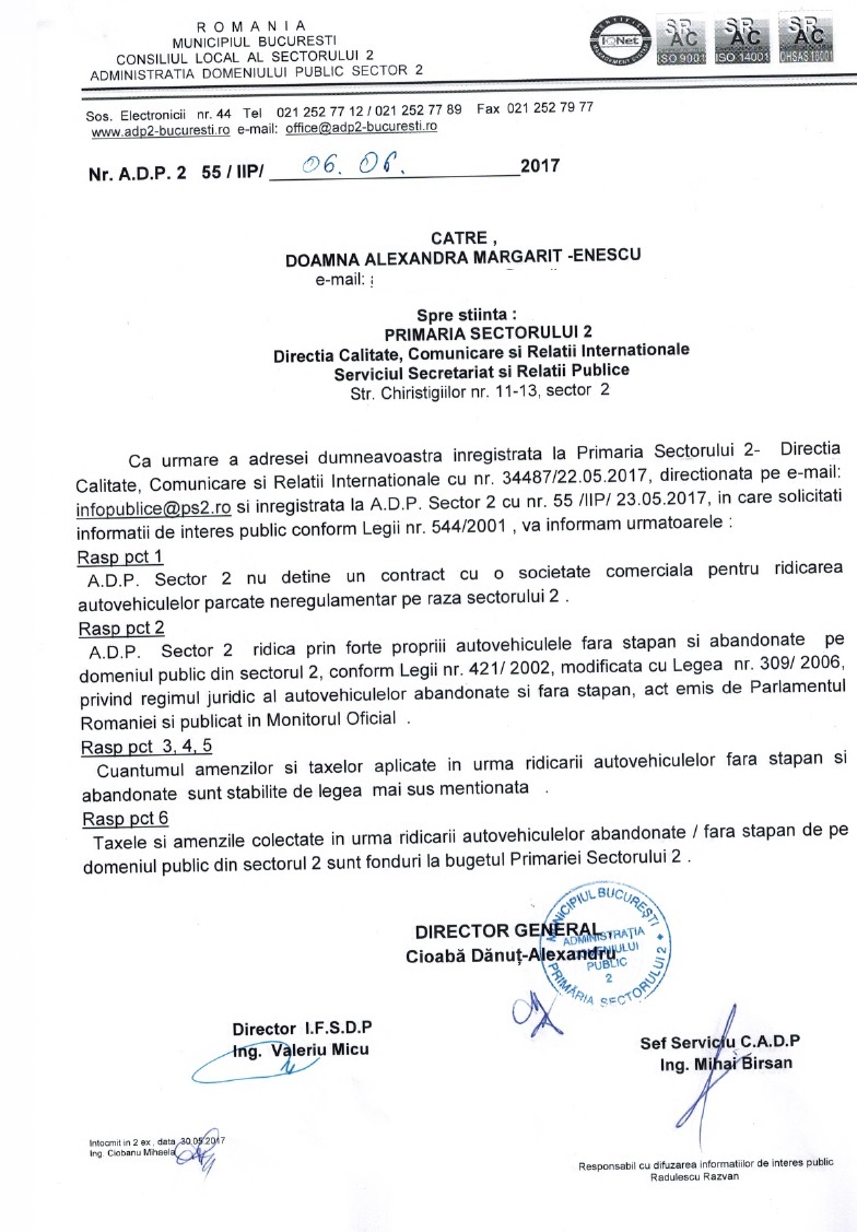 A doua zi după ce am scris articolul ACESTA, în a 17-a zi de la înregistrare, Administrația Domeniului Public (ADP) Sector 2 a răspuns cererii mele de informații legată de „ridicatul” mașinilor. Vă mai atașez o dată cererea ca să puteți citi în paralel întrebările și răspunsurile.