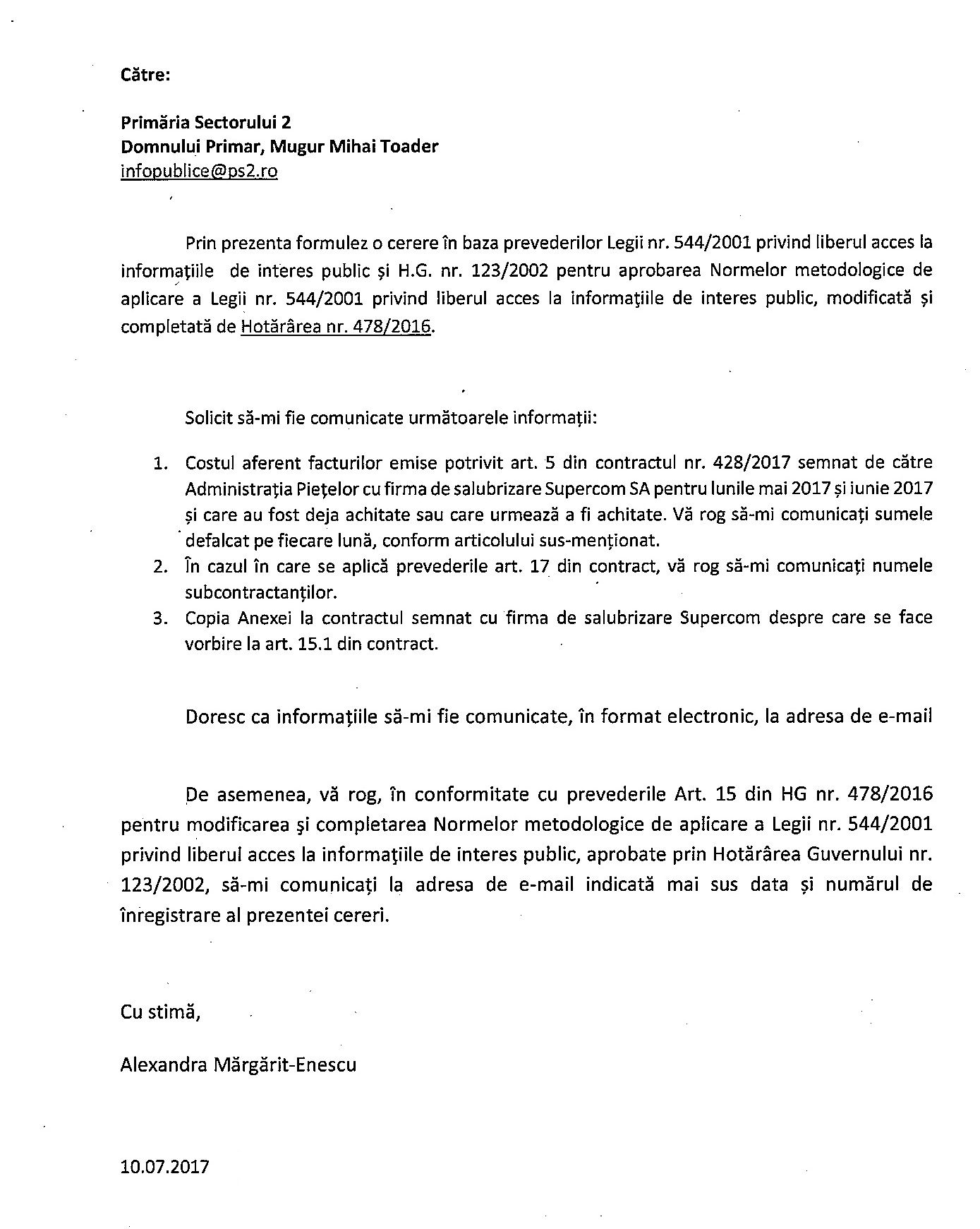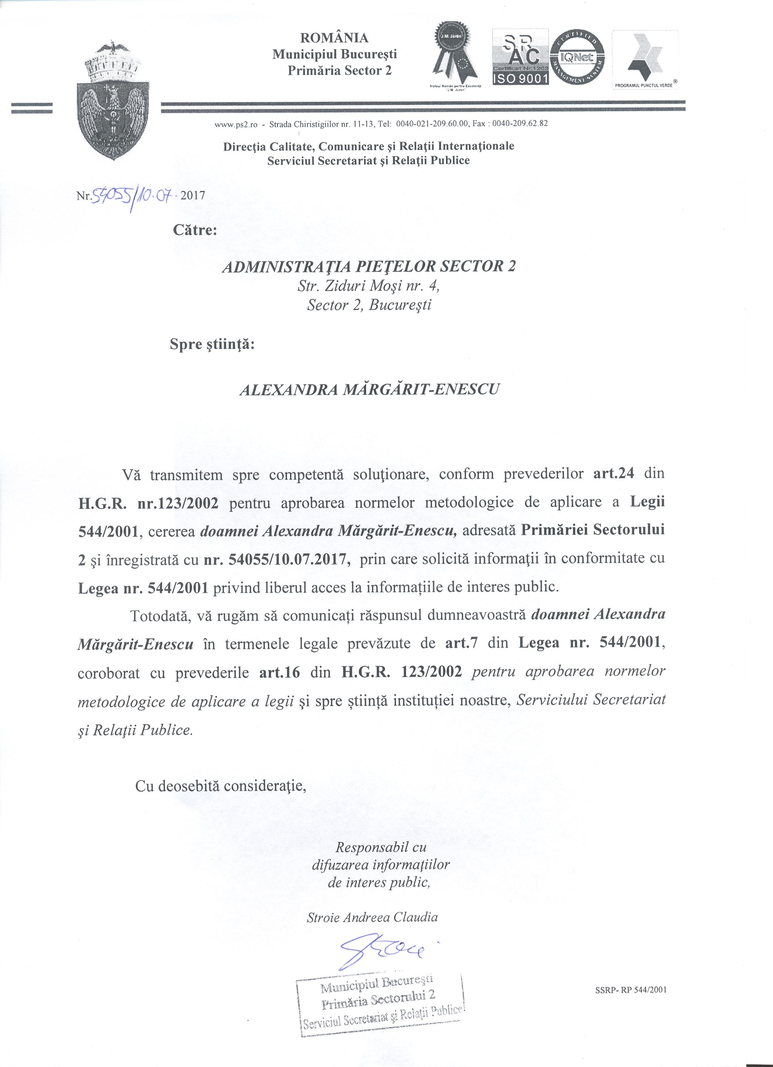 Ei bine, eu am iarăși o cerere de informații trimisă Primăriei Sectorului 2, înregistrată cu nr. 54055/10.07.2017 și nesoluționată!