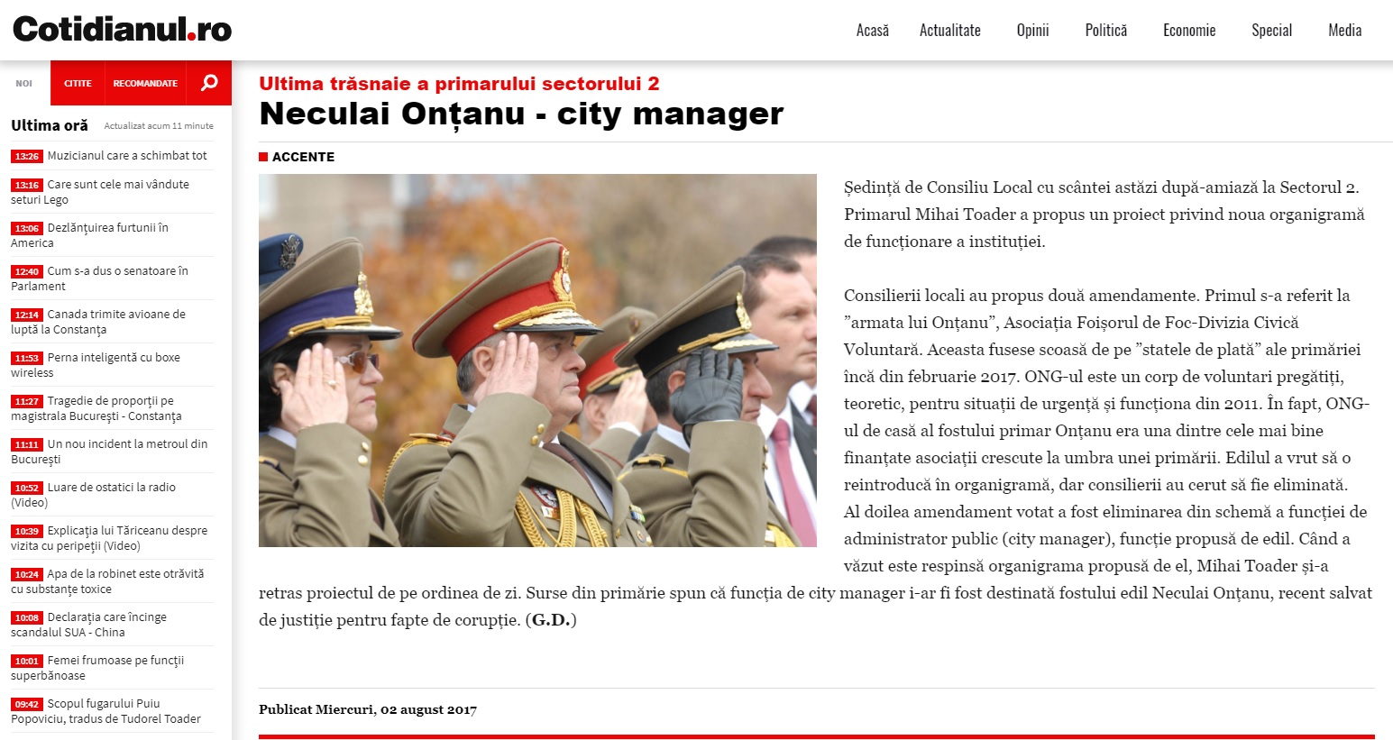 Un zvon „greu” a fost lansat săptămânile trecute: Neculai Onțanu se reîntoarce în Primăria sectorului 2, pe un loc călduț, pregătit de actualul primar. Astfel, Onțanu urma să devină city manager (administrator public), prin modificarea organigramei, preluând conducerea instituției din umbră, fără expunere politică reală. În același timp, pe fondul unor certuri în ședințele de Consiliul Local, a fost speculată și înființarea unei Direcții noi în primărie, structură în care urma să fie angajați membrii Asociației Divizia Civică Voluntară, o organizație neguvernamentală înființată și susținută financiar, inclusiv din fonduri publice, de Neculai Onțanu.