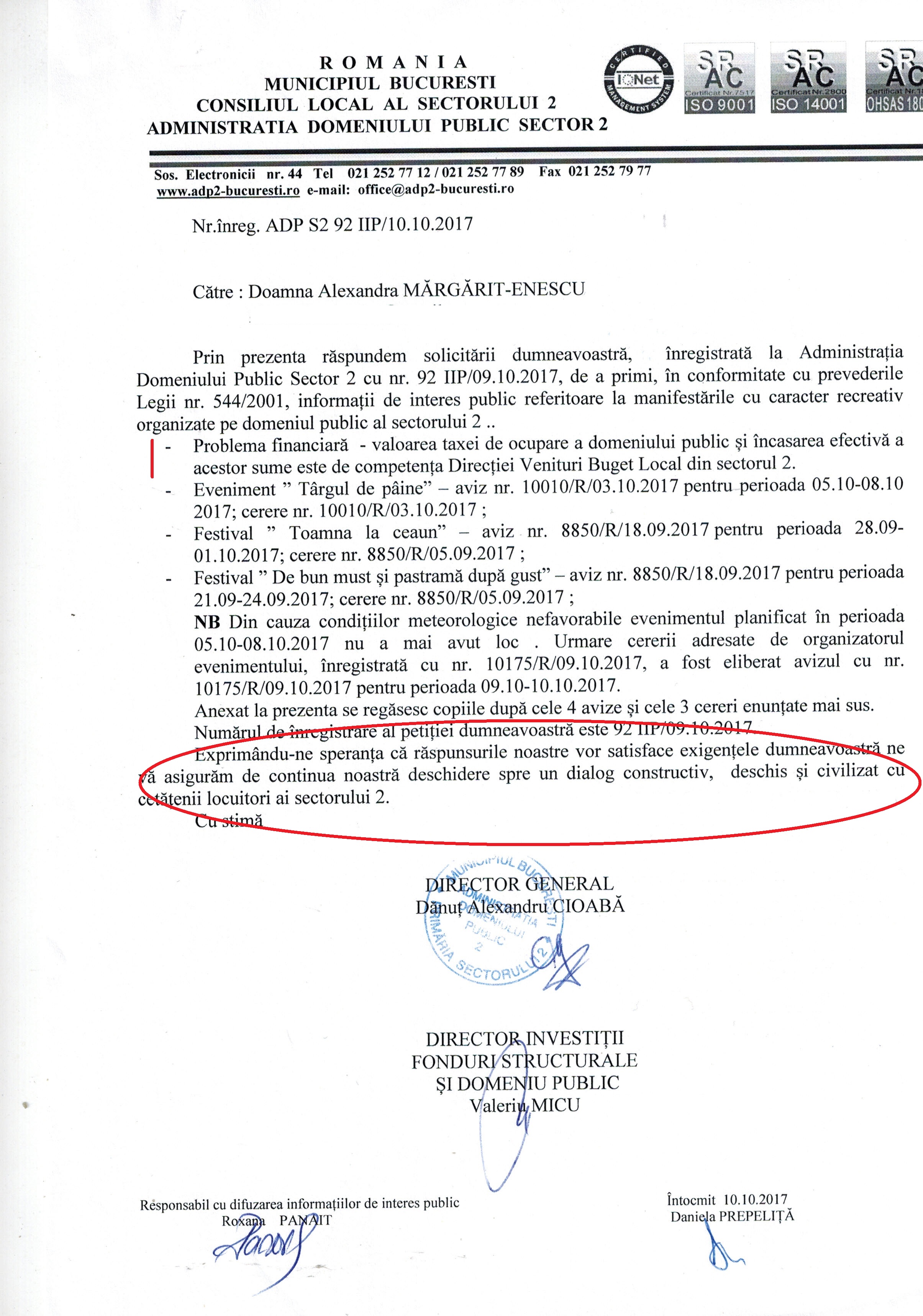 Așadar, ADP S2, dacă nu știe sumele pe care le cere pentru a elibera avize de ocupare, dar pe care firește le încasează Direcţia Venituri Buget Local Sector 2, instituție aflată tot în directa coordonare a viceprimarului Dan Cristian Popescu, are obligația legală (așa prevede Legea nr. 544/2001) să direcționeze cererea în maxim 5 zile, instituției care are competențe.