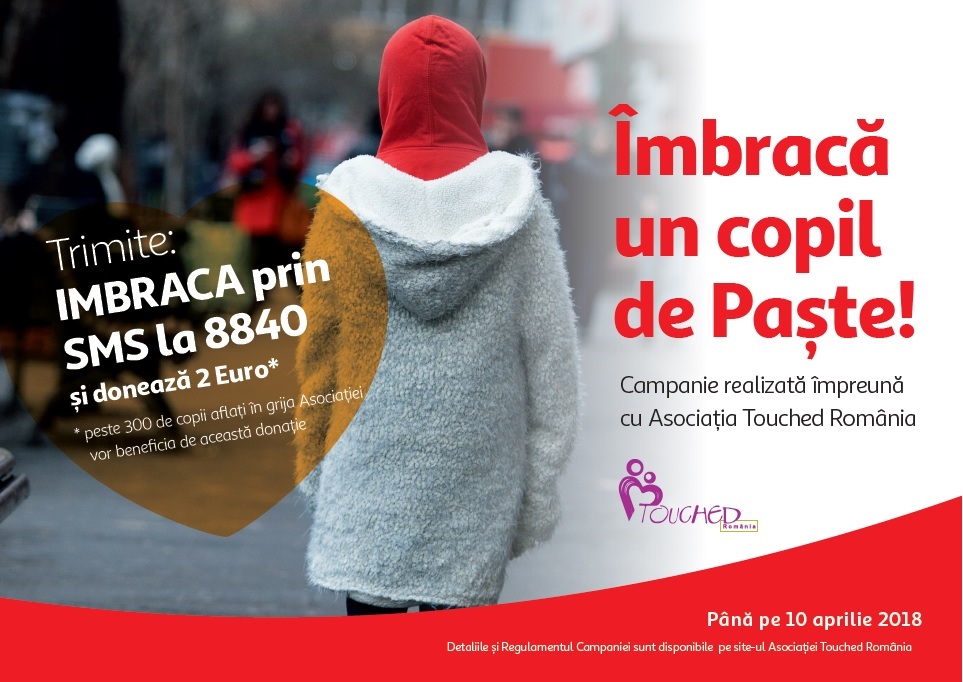 În aceste zile, Asociația Touched Romania desfășoară campania „Îmbracă un copil de Paște!” prin care oricine poate aduce un zâmbet pe chipul unuia din cei peste 300 de copii aflați în grija organizației. Tot ceea ce trebuie să faceți este să trimiteți textul „Imbraca„, prin SMS la numărul 8840, număr fără tarife suplimentare sau suprataxare, donând astfel 2 euro.