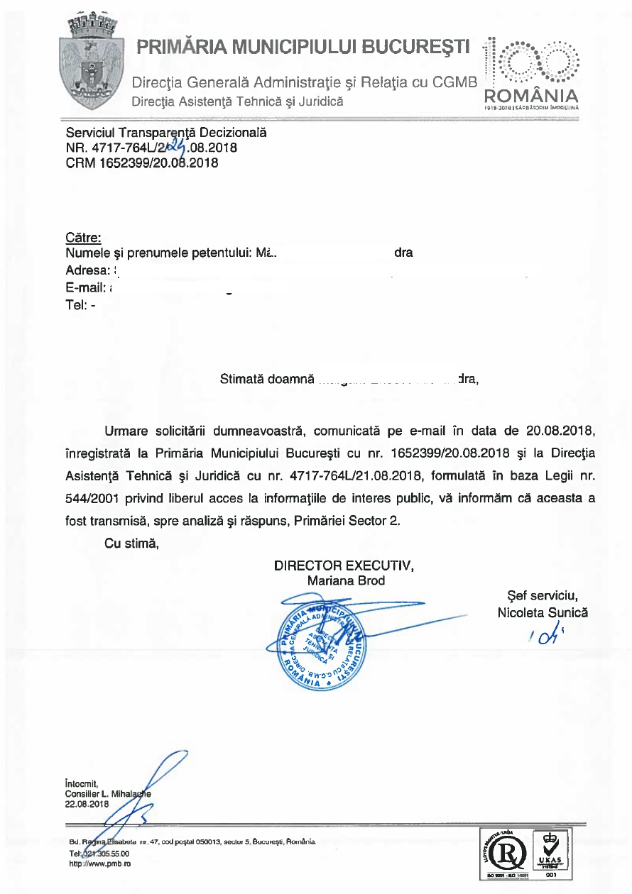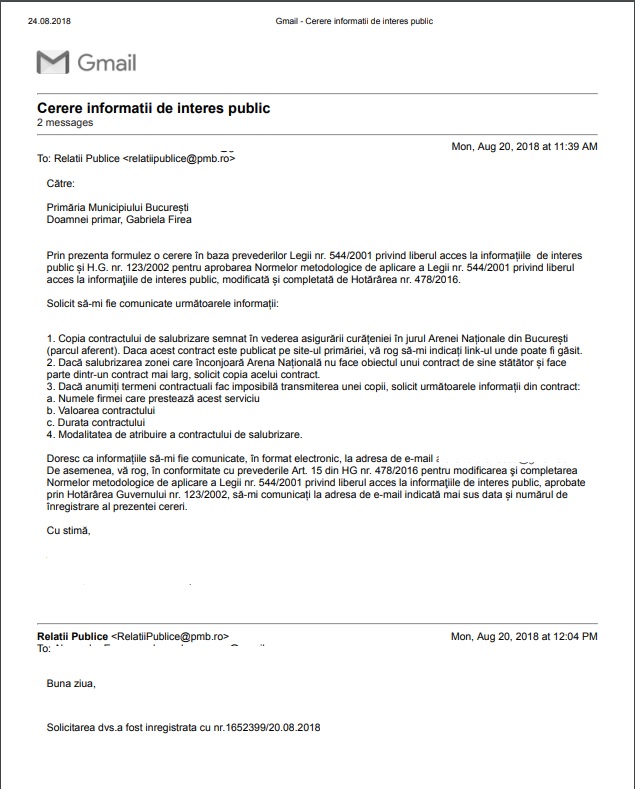 Legislația privind liberul acces la informații de interes public prevede că orice cerere care nu intră în sfera ta de competențe ca instituție trebuie redirecționată către autoritatea competentă în maxim 5 zile, cu informarea cetățeanului. PMB a executat în conformitate deplină prevederile legale. Au trecut 4 zile de când le-am solicitat informații legate de salubrizarea zonei care înconjoară Arena Națională. Astăzi au răspuns că au redirecționat cererea spre soluționare Primăriei Sectorului 2.