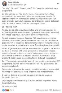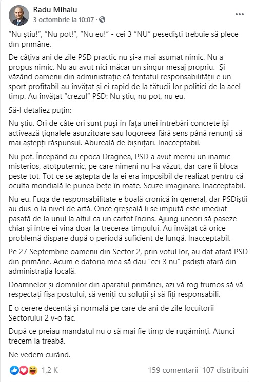 Personal, vă propun o altă abordare. Lăsați postările pe Facebook pentru cei care vă ajută la comunicare. Vă recomand o pagină oficială în calitate de Primar, fără însemne politice, favoritisme și promisiuni deșarte. Și, mai ales, fără amenințări. Pagina ar trebui să fie o interfață, zilnică, între dumneavoastră și cetățeni despre activități, ședințe, consilieri, întâlniri publice, etc.