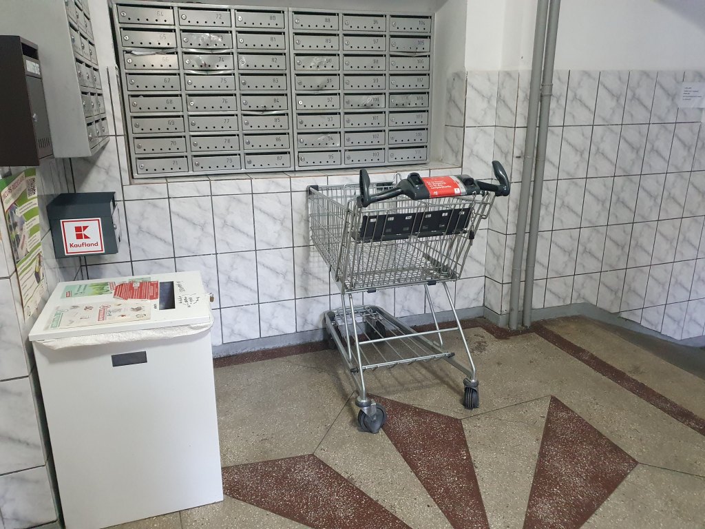 La parterul blocului unde locuiesc, este un magazin Kaufland. Oamenii din zonă își fac cumpărăturile aici și, uneori, cumpără suficient de mult încât le e greu să care până acasă pungile pline.