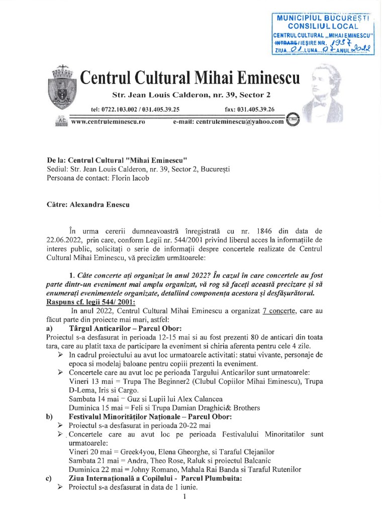 Urmare demersurilor, am primit răspunsul Centrului Cultural Mihai Eminescu legat de organizarea concertelor și evenimentelor din primele 6 luni ale acestui an. Și, din păcate, nu mare mi-a fost mirarea să văd că au păstrat punctul de vedere, pe care și primarul mi l-a împărtășit, și anume acela că motivarea hotărârilor de Consiliu Local nu este publică, prin urmare nu mi-au comunicat nicio notă de fundamentare cu privire la nevoia organizării evenimentelor.